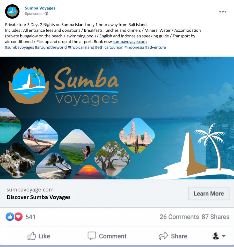 Illustration, Logo Sumba Voyages Publié par ydelmas31 le 17 juillet 202417 juillet 2024 Sumba Voyages est une agence de voyage éco-responsable basé sur l’île de Sumba en Indonésie.J’ai pu réaliser avec leur collaboration une marque à leur image, qui représente leur valeur de préservation de la vie locale et d’éco-tourisme responsable. Partager : Partager sur X(ouvre dans une nouvelle fenêtre) X Partager sur Facebook(ouvre dans une nouvelle fenêtre) Facebook J’aime chargement… Similaire